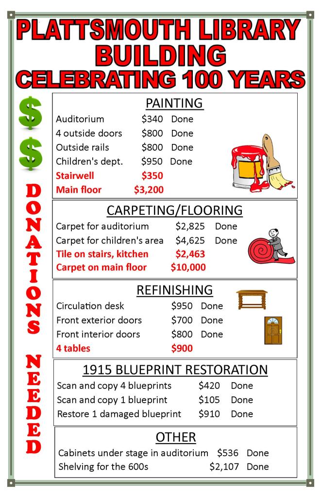Library Sprucing Up! Donations NeededThe library is preparing for the 100th anniversary of the building this year. We will have programs in April and November honoring the laying of the cornerstone in April 1916 and the opening of the library in November 1916. In September, the Library Foundation mailed letters to about 125 local businesses asking for donations. The library would like to thank the more than 30 businesses and individuals for their donations: